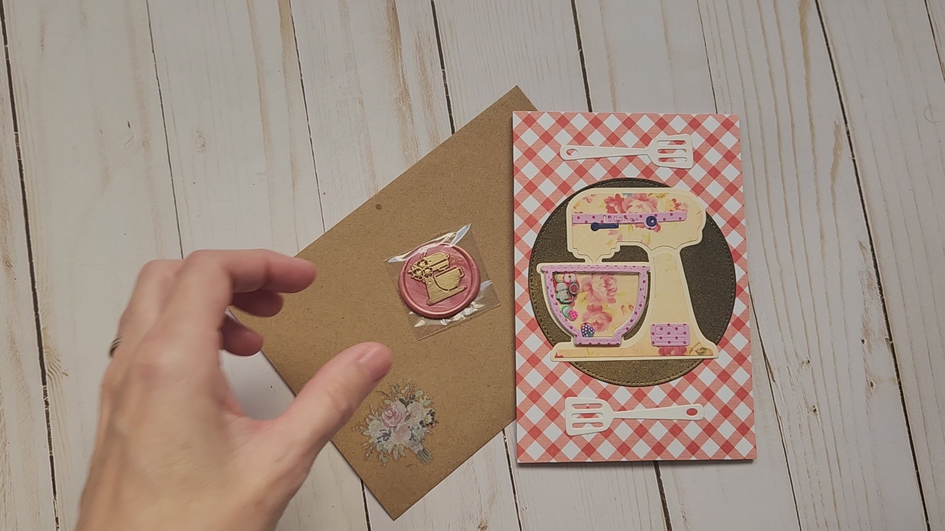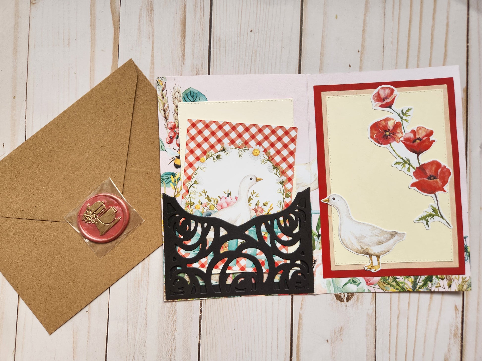 La tarjeta viene con un sobre de color de color kraft y un sello de cera autoadhesivo también decorado. La tarjeta mide aproximadamente 15.5x10.5cm y desplegada 21cm aprox .