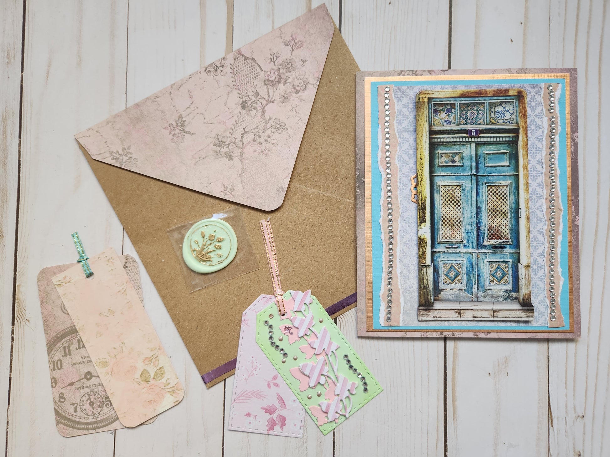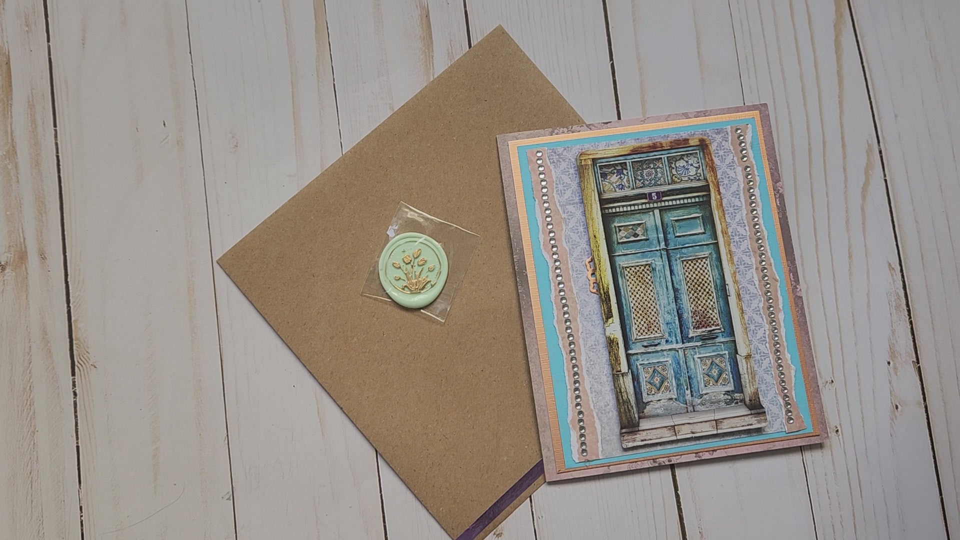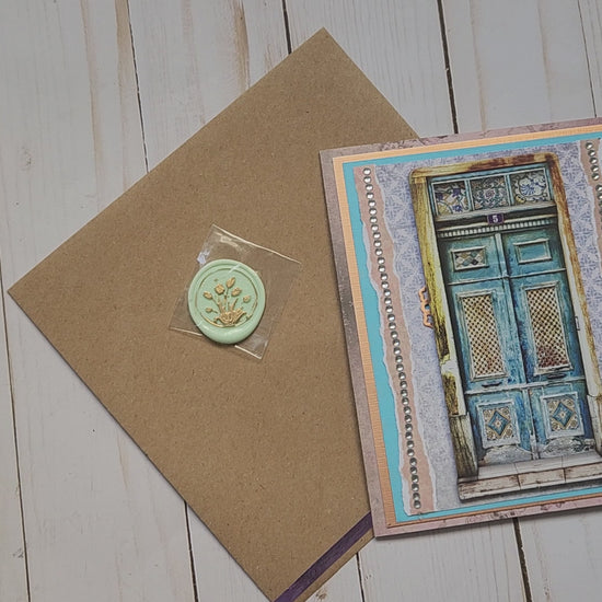 La tarjeta viene con un sobre de color de color kraft y un sello de cera autoadhesivo también decorado. La tarjeta mide aproximadamente 15.5x12 y desplegada 25cm aprox .