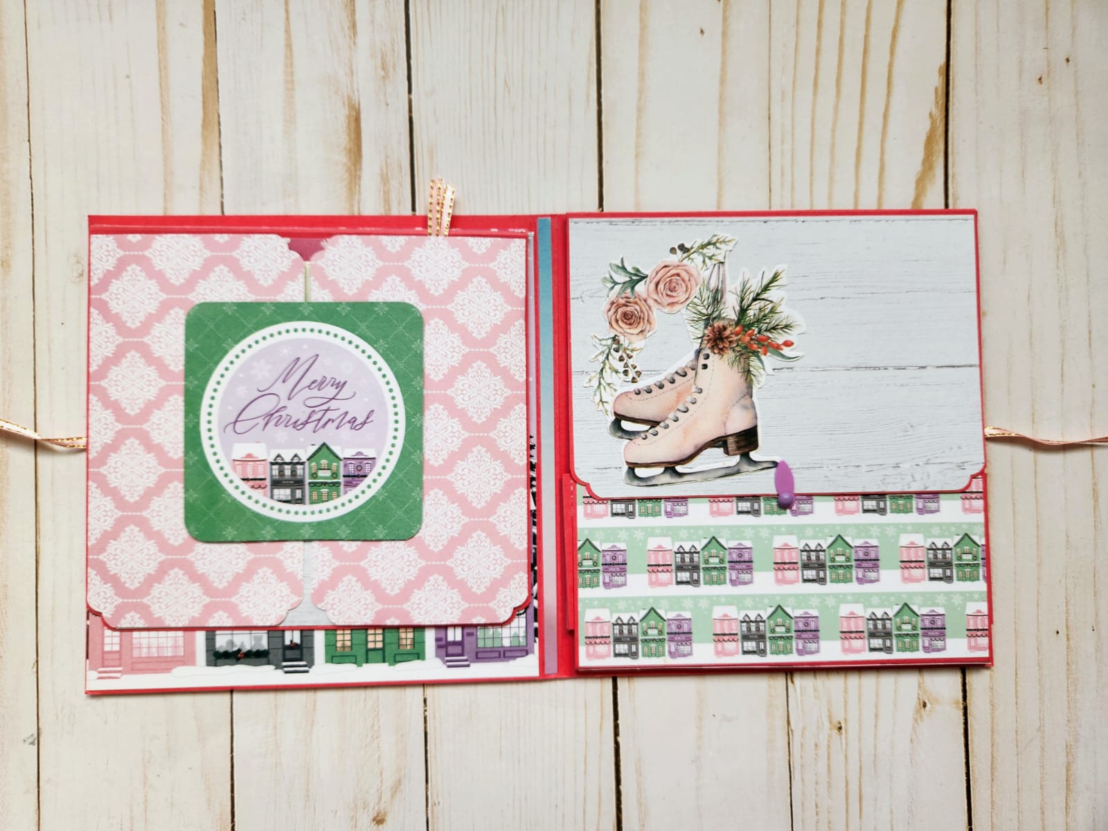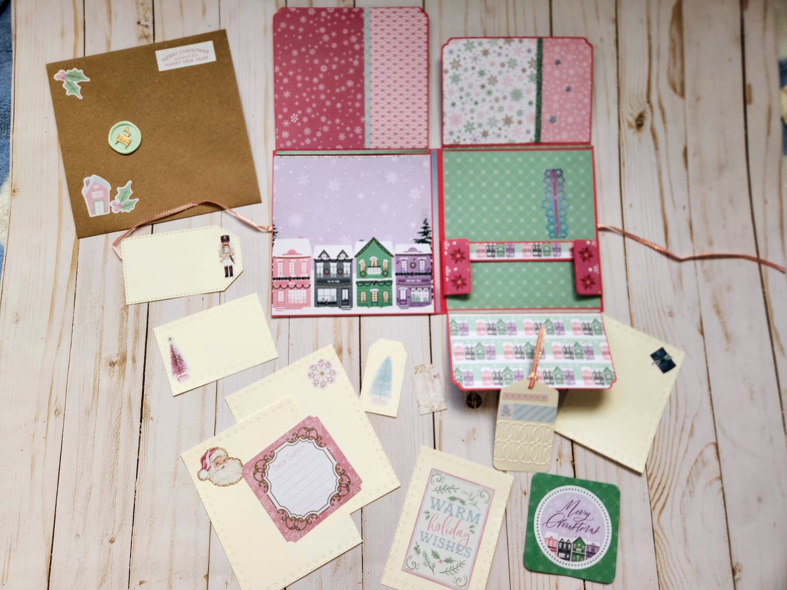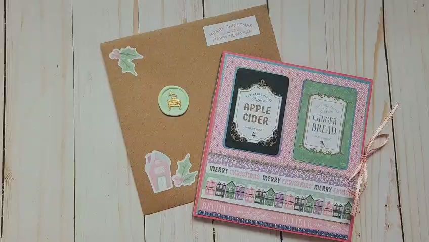 Esta tarjeta de Navidad contiene varios bolsillos, cuartillas para escribir, etiquetas y más sorpresas. La tarjeta plegada mide 15x15 cm aproximadamente. Viene con un sobre de color kraft y un sello de cera autoadhesivo.