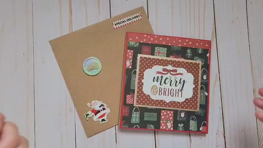 Esta tarjeta de Navidad contiene varios bolsillos, cuartillas para escribir, etiquetas y más sorpresas (se puede ver en las fotos su contenido completo). La tarjeta plegada mide 15.5x15 cm aproximadamente. Viene con un sobre de color kraft y un sello de cera autoadhesivo.