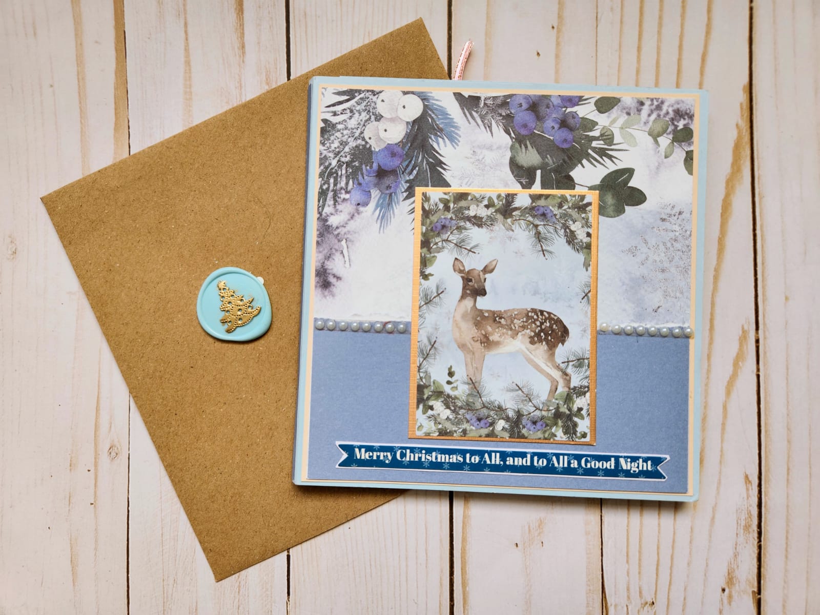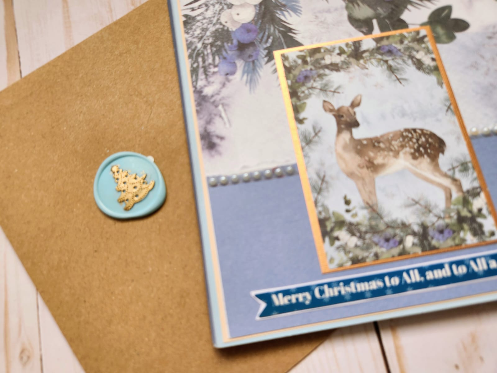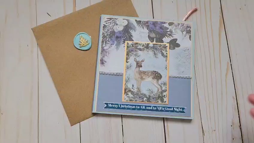 La tarjeta mide 15x15cm aproximadamente, mientras que abierta es de 45 cm de largo. Viene con un sobre de color kraft y un sello de cera autoadhesivo.