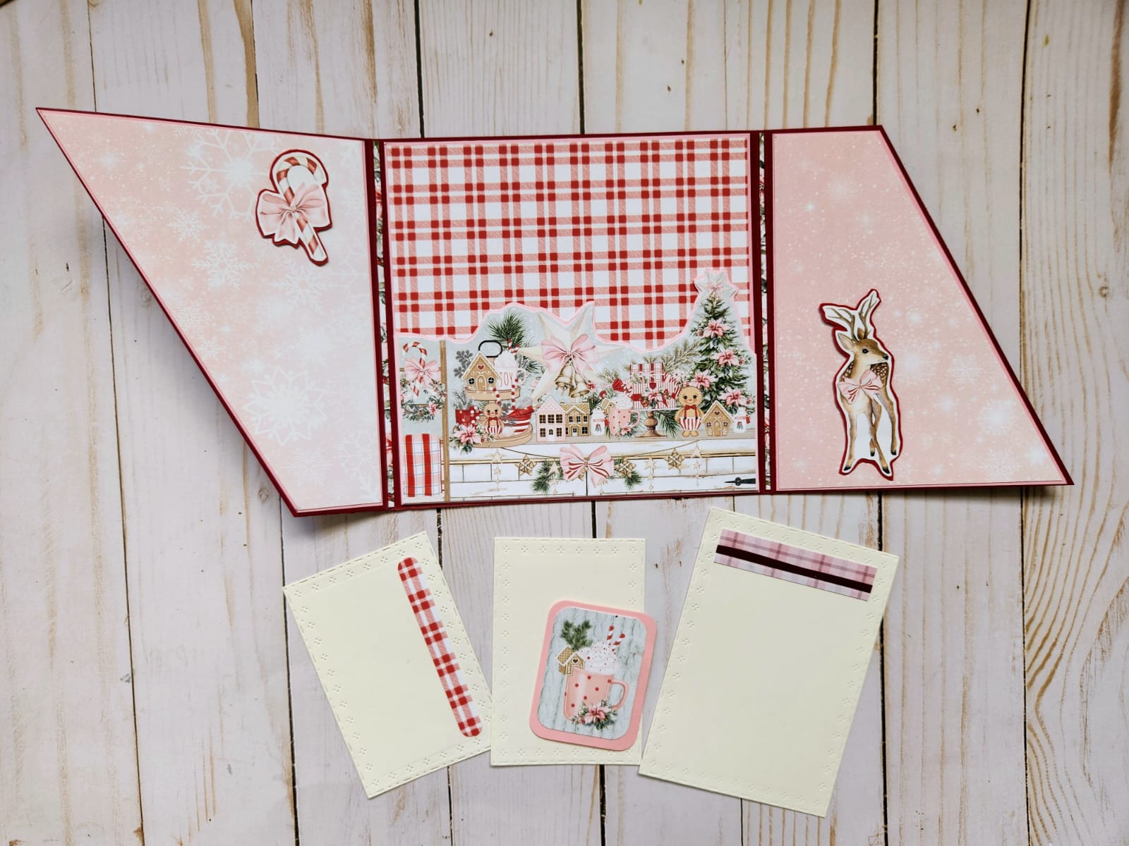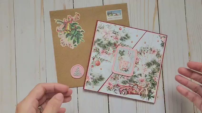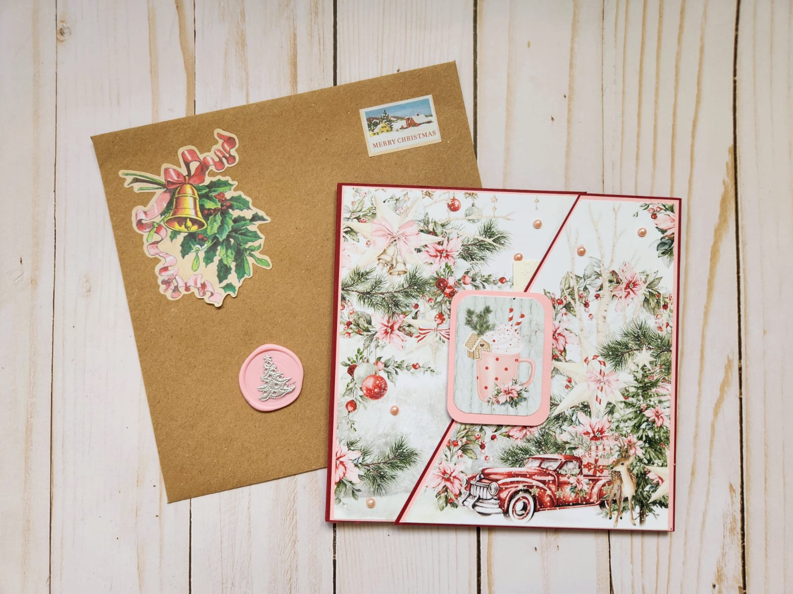 Tarjeta de temática navideña en tonos rojo, rosa verde y blanco. La portada con abertura en diagonal y cierre magnético, le da un toque diferente, Muy apropiada para mandar por correo o darla en mano, es un regalo perfecto para alegrar a un ser querido, o como regalo original a cualquier persona ya que son piezas únicas hechas a mano. La tarjeta viene con un sobre de color kraft, y un sello de cera autoadhesivo. La tarjeta mide aproximadamente 40cm abierta y 15.5cm sin desplegar.