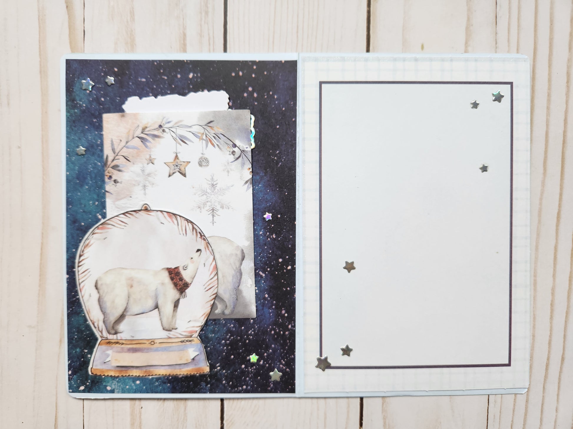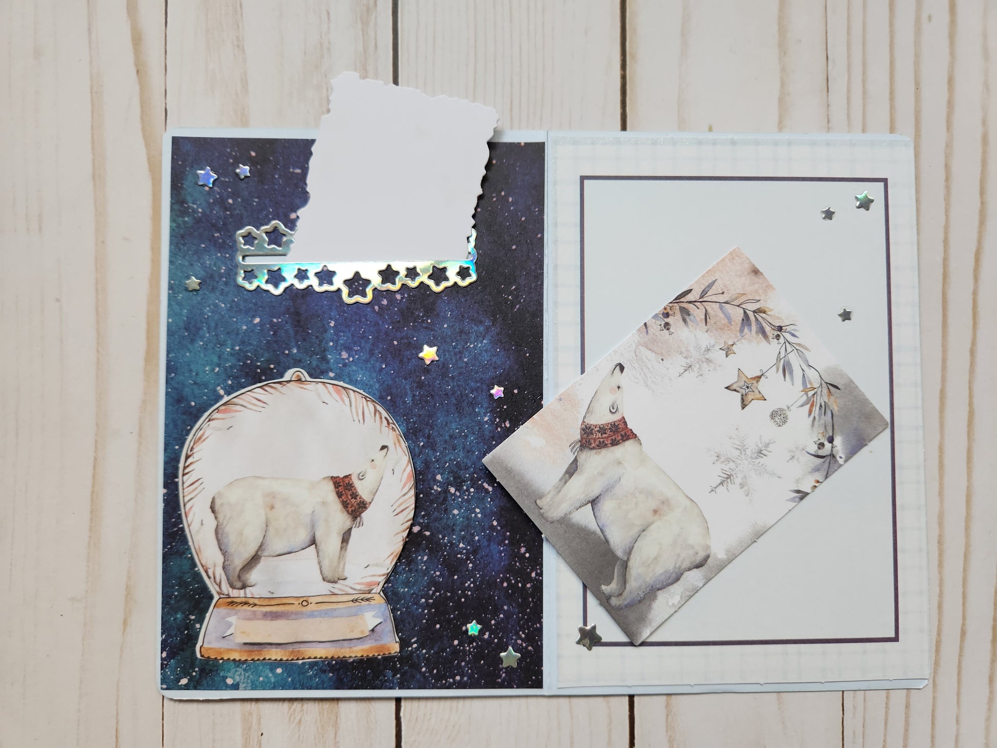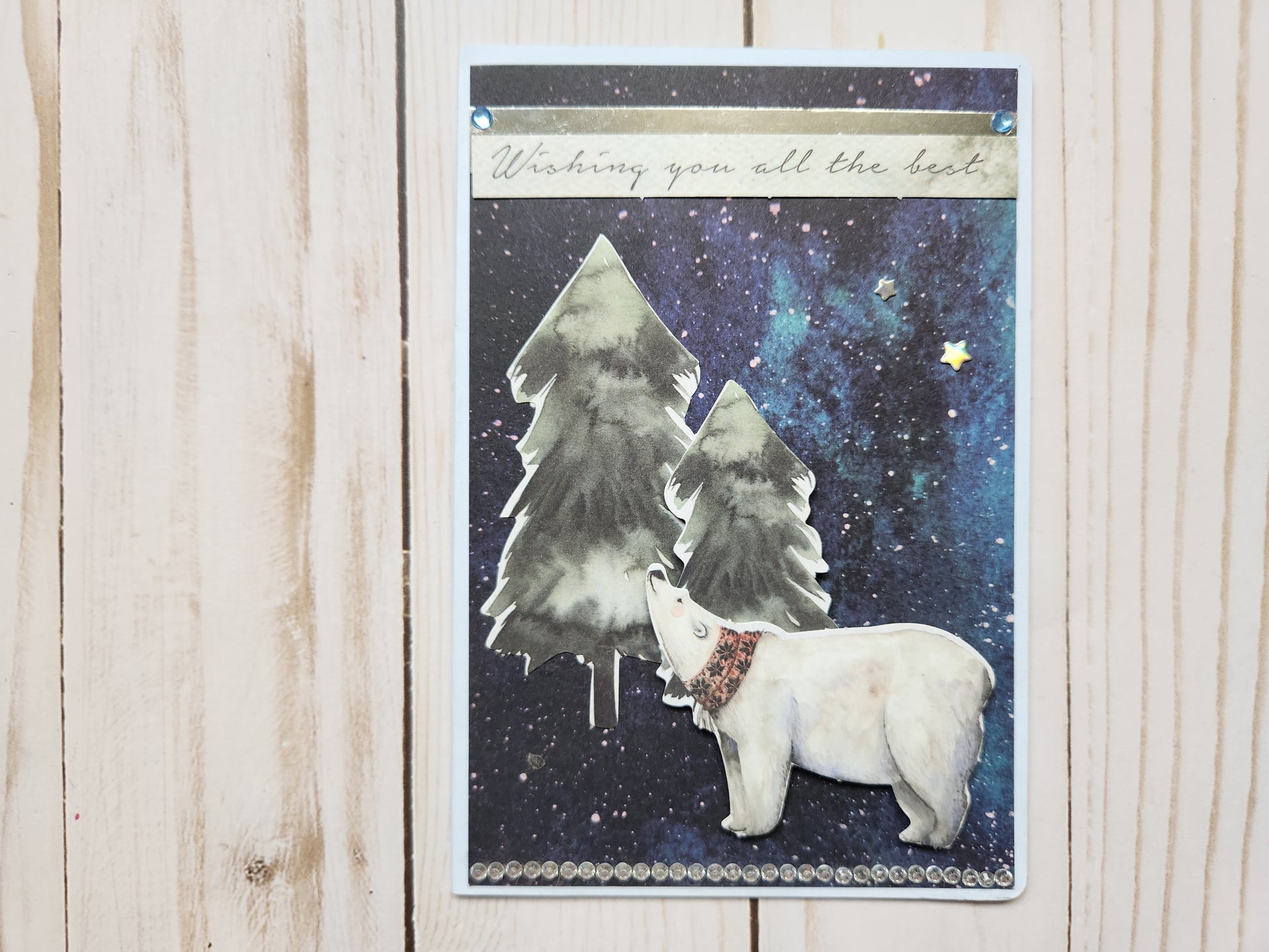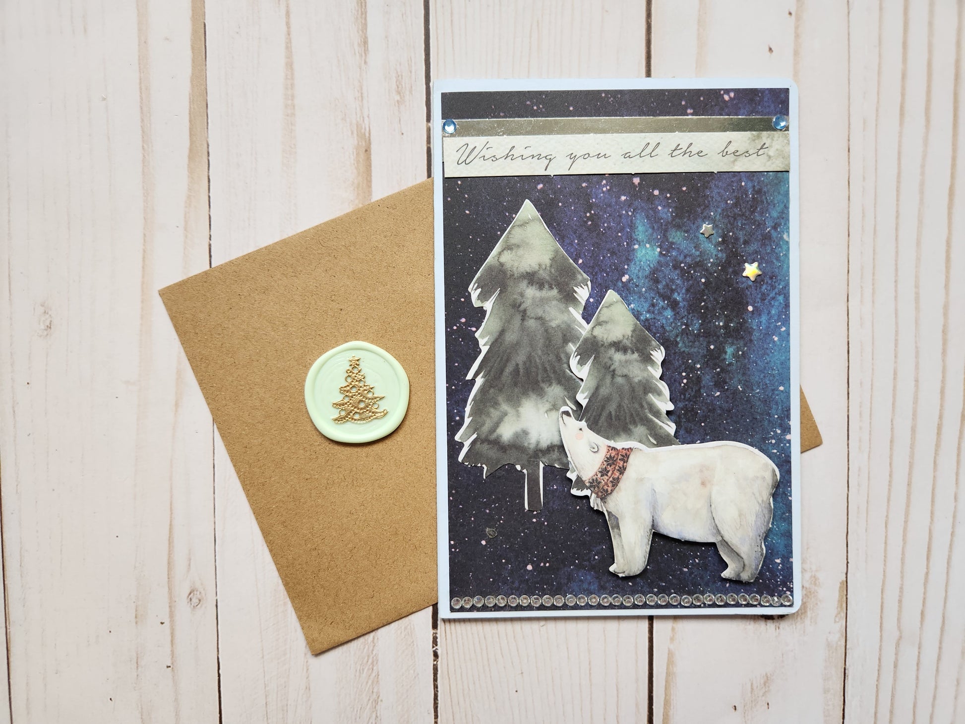 Tarjeta de temática invernal. En la portada una inscripción que dice: Wishing you all the best. El interior contiene dos bolsillos con etiquetas y estampitas con paisajes invernales.